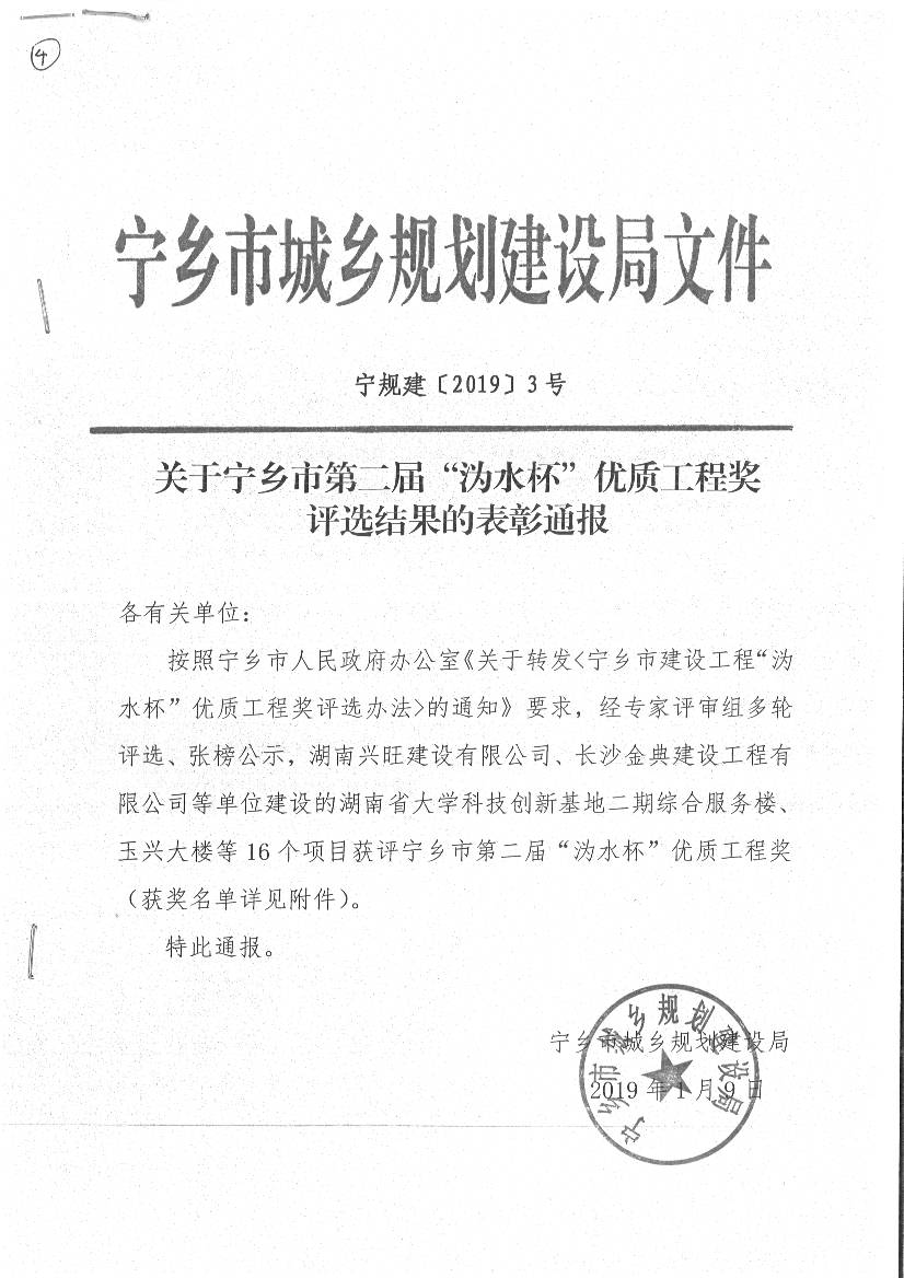 关于宁乡市第二届“沩水杯”优质工程奖评选结果的表彰通报